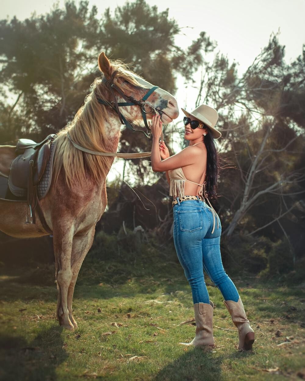 Combine cowgirl style with a touch of glamour. Think sparkly jewelry, bold makeup, and luxurious fabrics against a rustic backdrop.