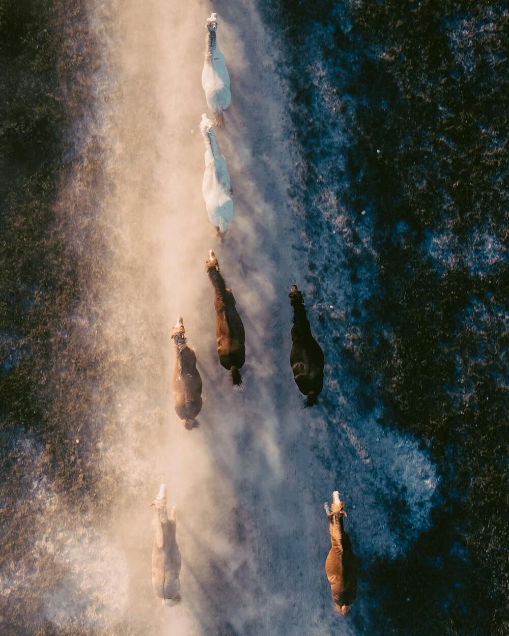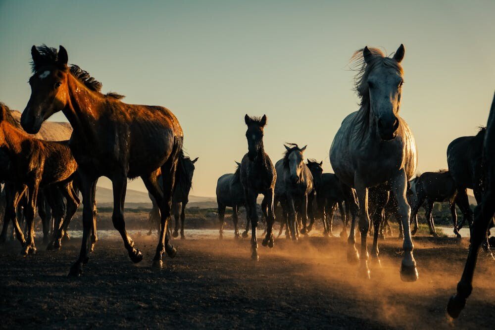 Gallop along the sandy shores with the sun setting in the background. The reflection on the water creates a magical scene.