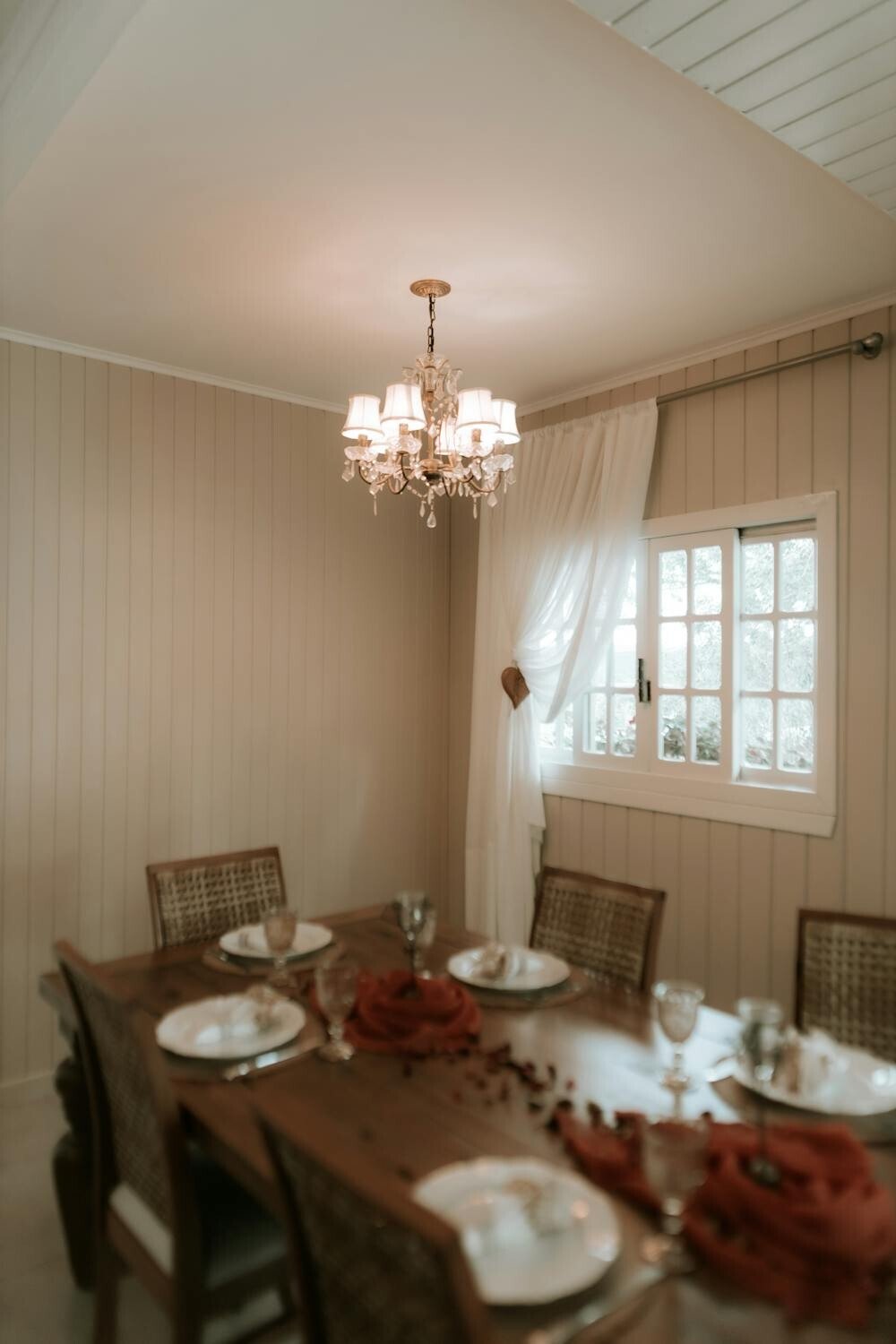 Illuminate your space with a wrought iron chandelier. Its intricate design and dark finish add elegance and drama to any room. The contrast with rustic wood creates a striking effect.