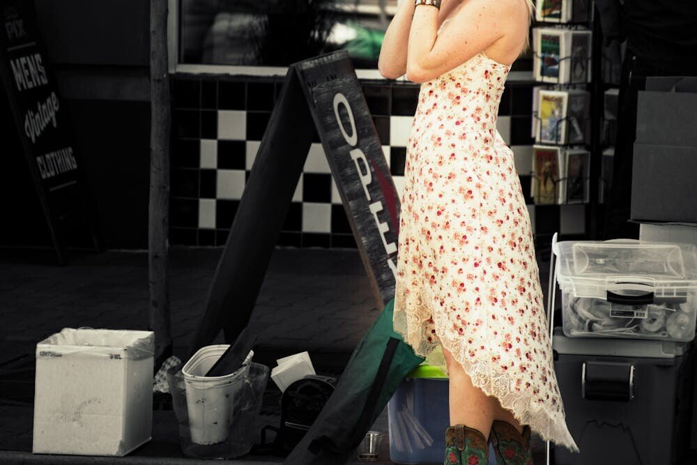 The classic design of the boots complements the vintage appeal of the dress. It’s a perfect outfit for a day at the flea market or a retro-themed party.