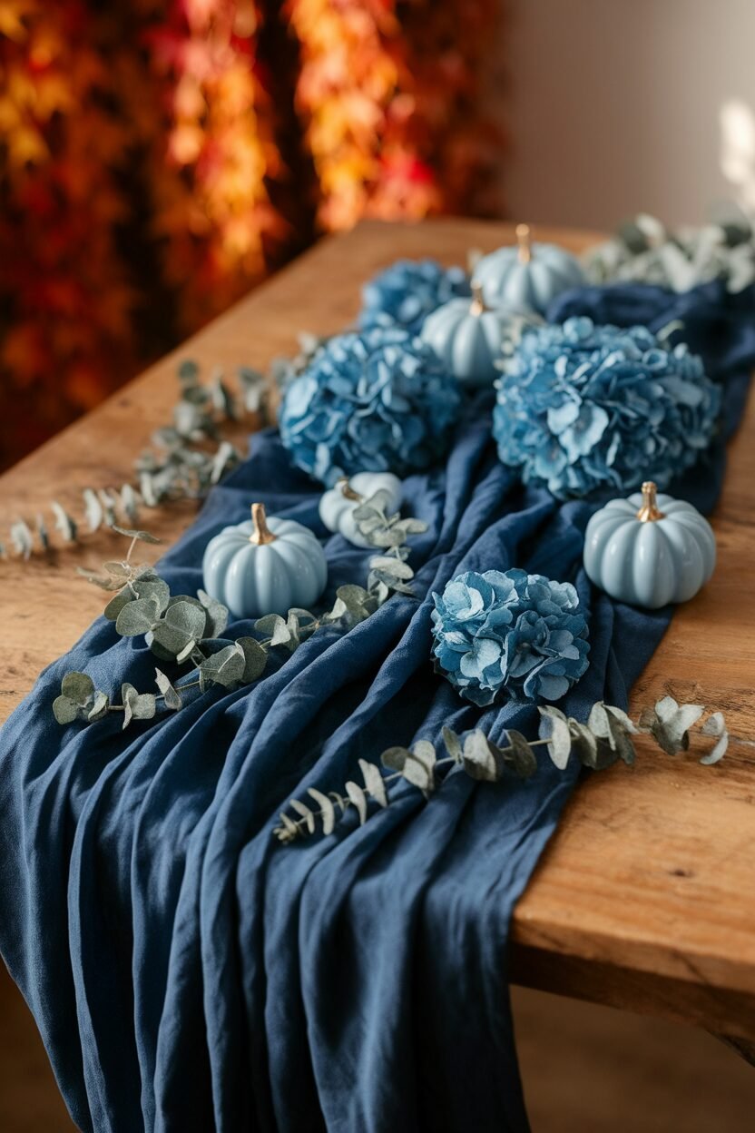 An indigo table runner can set the tone for your dining room. It’s like a canvas for your fall centerpieces, from pumpkins to candles. The dark blue hue offers a sophisticated backdrop.