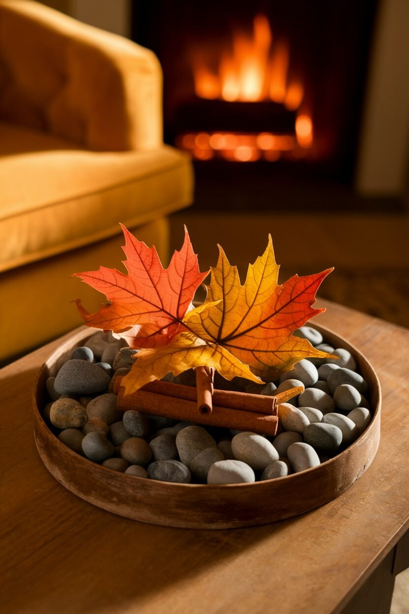 A rustic wooden tray can be the foundation of your fall-themed coffee table. Its natural texture adds warmth and charm, making everything you place on it stand out. Trays are also practical, keeping your decor organized and easily movable.
