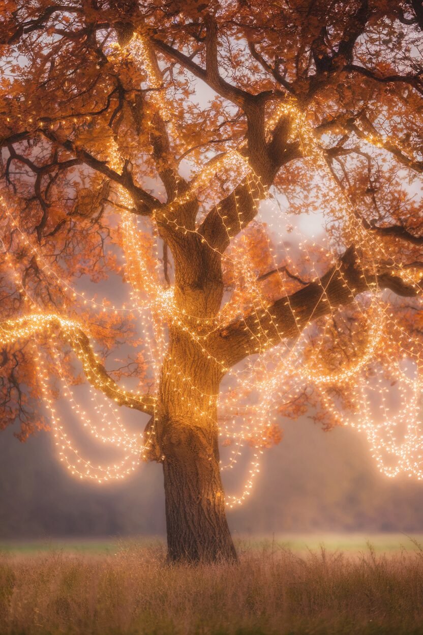 Imagine your tree shimmering with tiny lights like stars in the night sky. Fairy lights add a magical touch to fall trees, perfect for long cozy evenings. They’re affordable and easy to find at most stores.