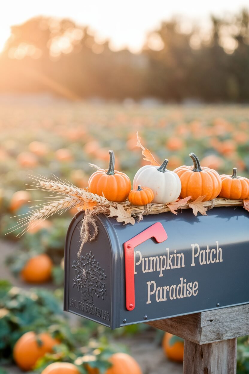 Imagine your mailbox surrounded by a mini pumpkin patch! Small pumpkins of varying shades line the base, creating a cozy autumn feel. It’s like having a piece of the pumpkin patch right at your curb.