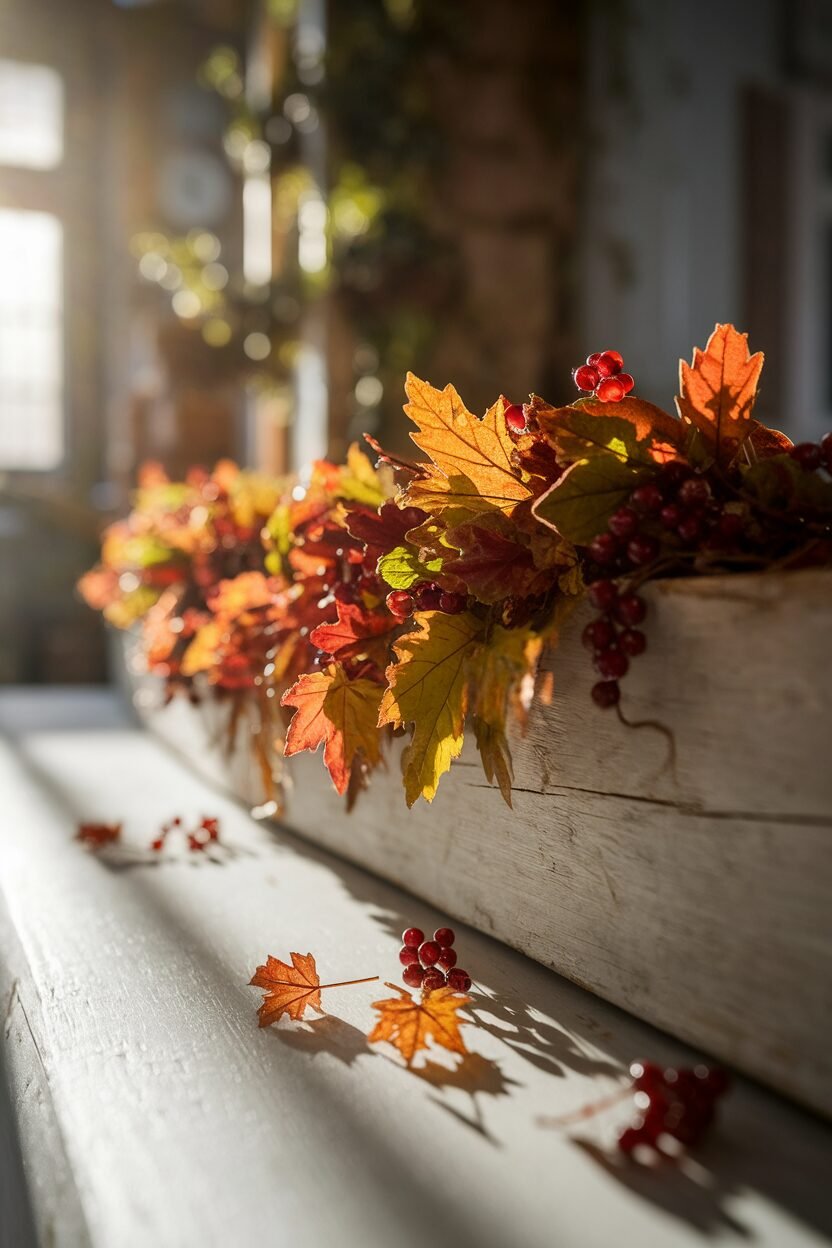 Bring the beauty of fall indoors with a leafy garland made from faux leaves. String together an array of colorful leaves using a needle and thread, or hot glue them onto a piece of twine.