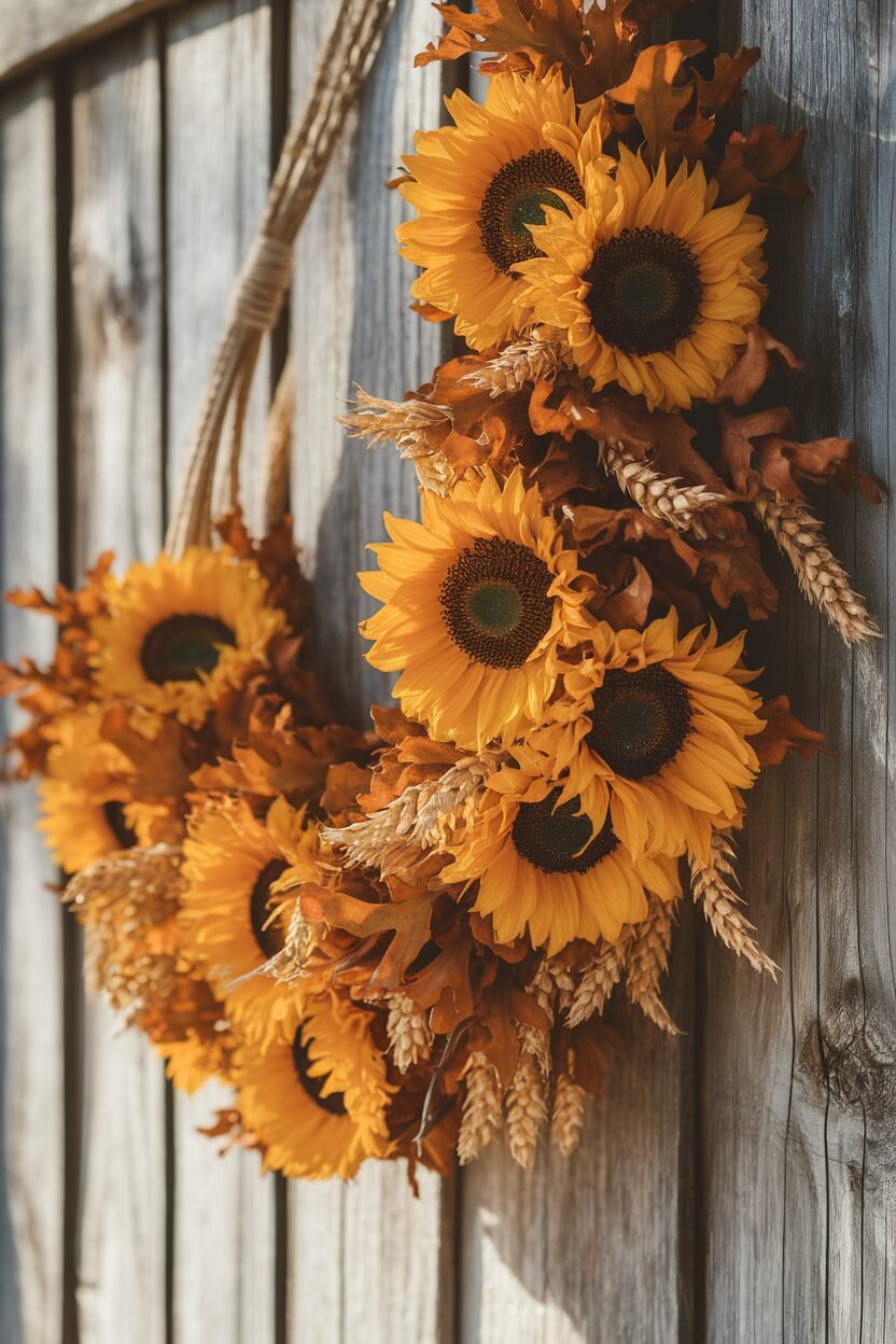 Bring sunshine to cloudy fall days with a sunflower garland. Bright yellow petals against your door will make anyone smile.