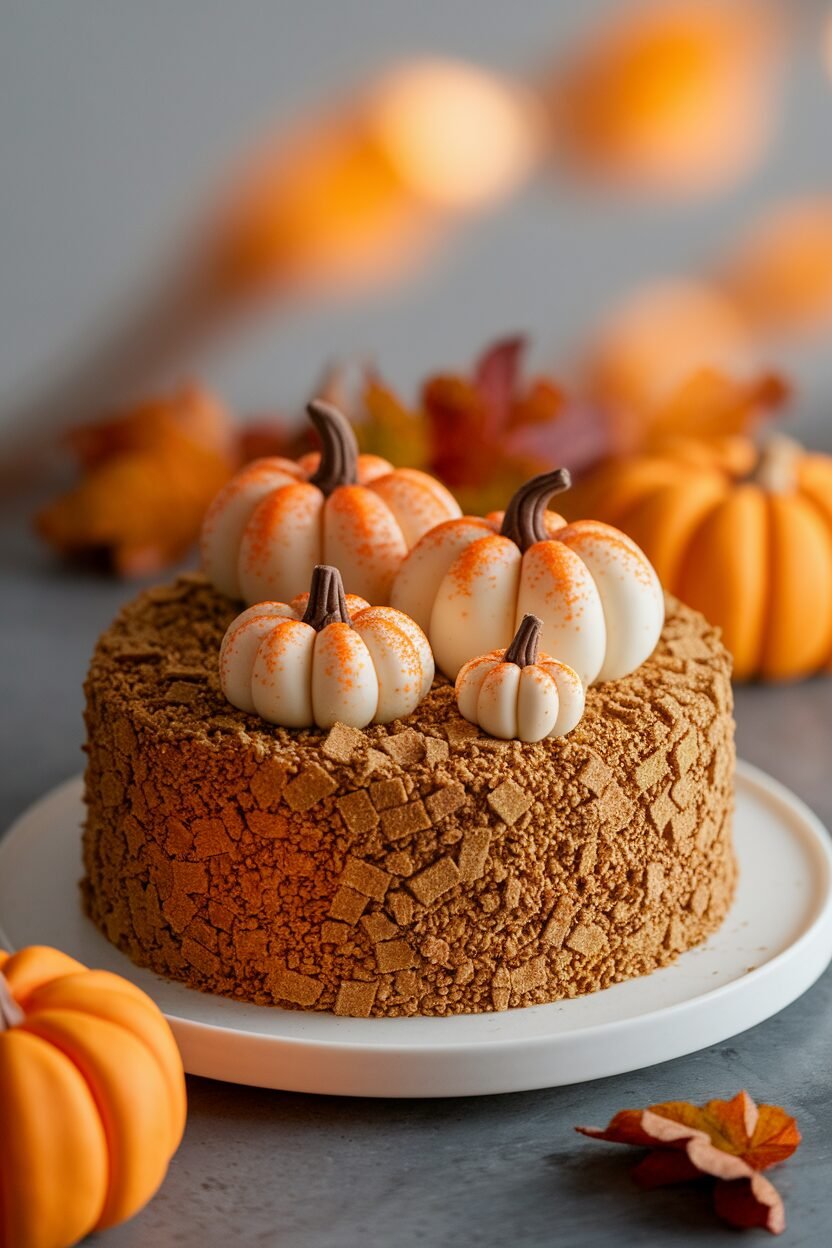 Create a mini pumpkin patch right on your cake! Use orange fondant or marzipan to shape tiny pumpkins. Arrange them on top of a textured green frosting base that mimics grass.