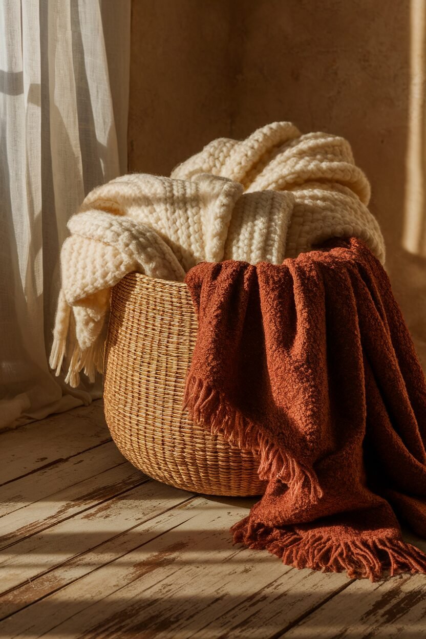 Place this basket by your couch or fireplace. It’s both functional and decorative, perfect for those chilly fall evenings. This trend is all about layering textures, making your space inviting and snug.