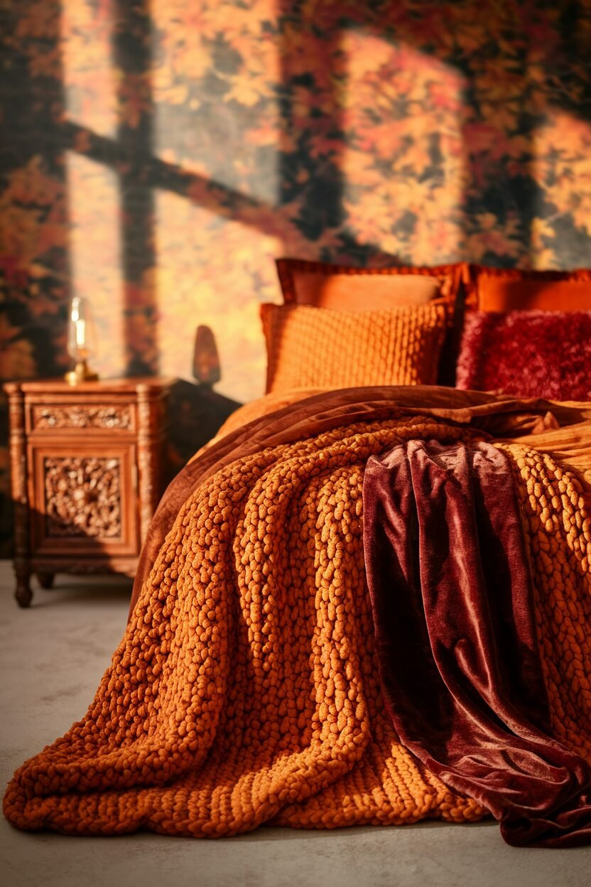 A fall bedroom isn’t complete without the warm glow and comforting aroma of scented candles. Think pumpkin spice, cinnamon, or apple cider.