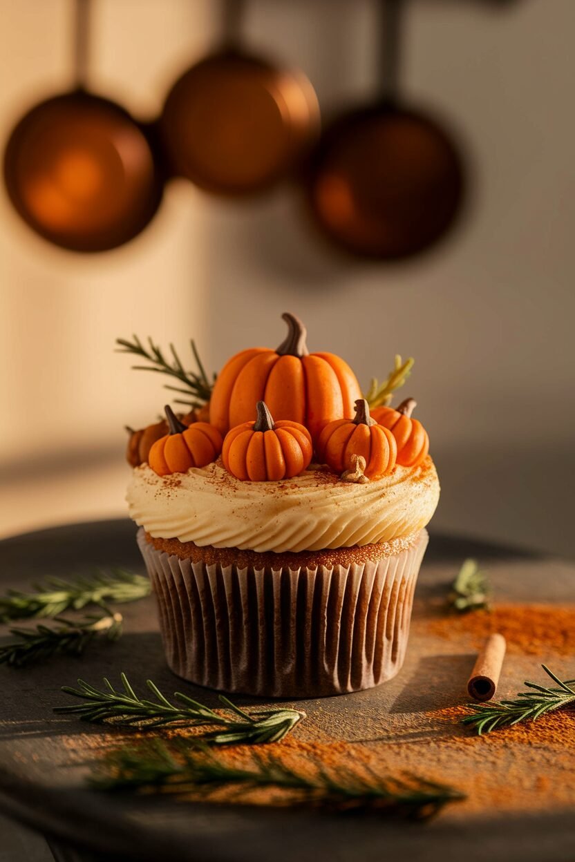 Picture a tiny pumpkin patch right on your cupcake. These cupcakes feature mini fondant pumpkins sitting atop a green buttercream base. The bright orange contrasts beautifully with earthy green, bringing fall vibes to your dessert table.