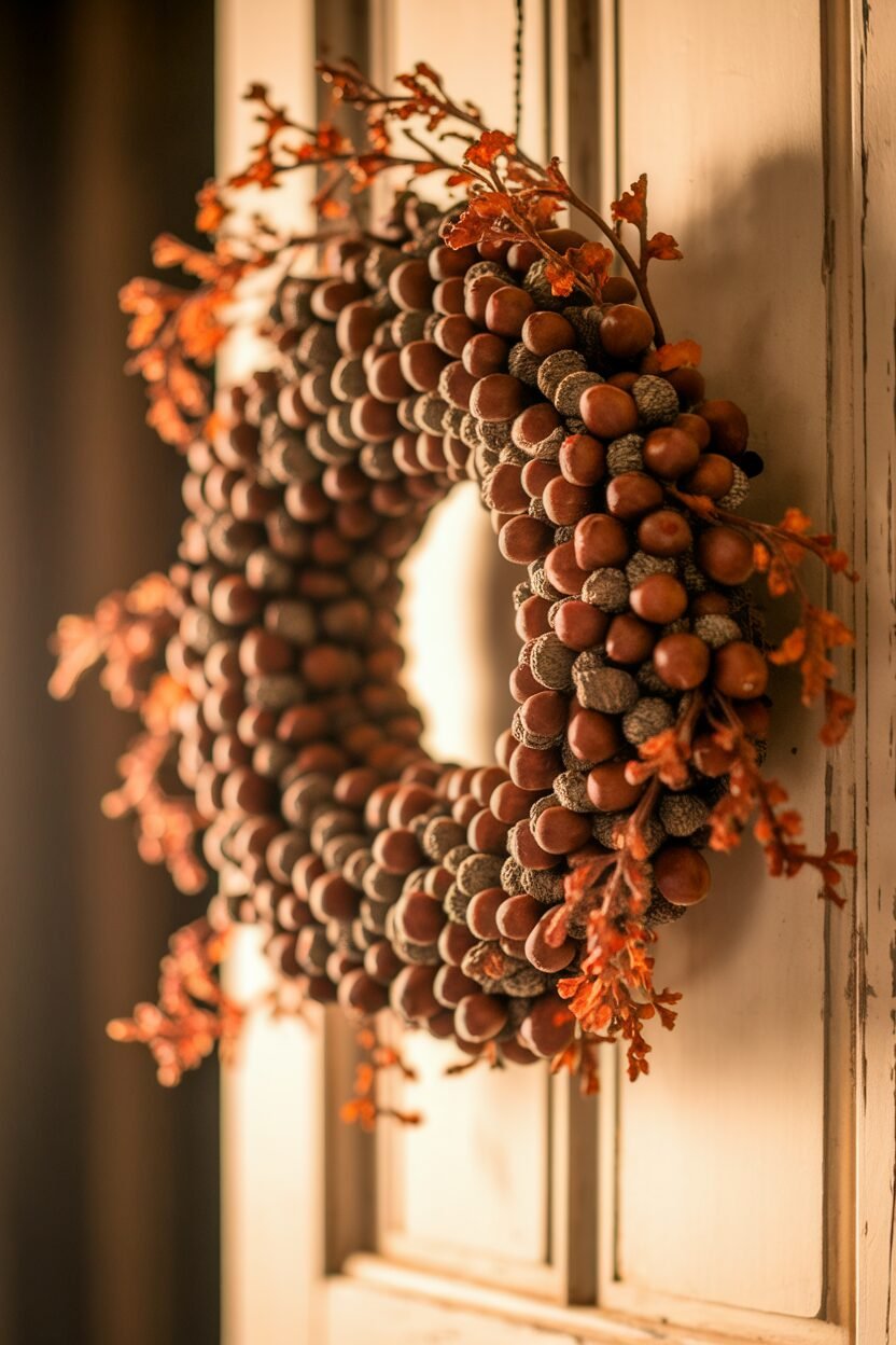 Picture a wreath made entirely of acorns, greeting guests with a touch of whimsy. Acorns are a classic fall element, and when gathered together, they create a charming welcome for your front door.