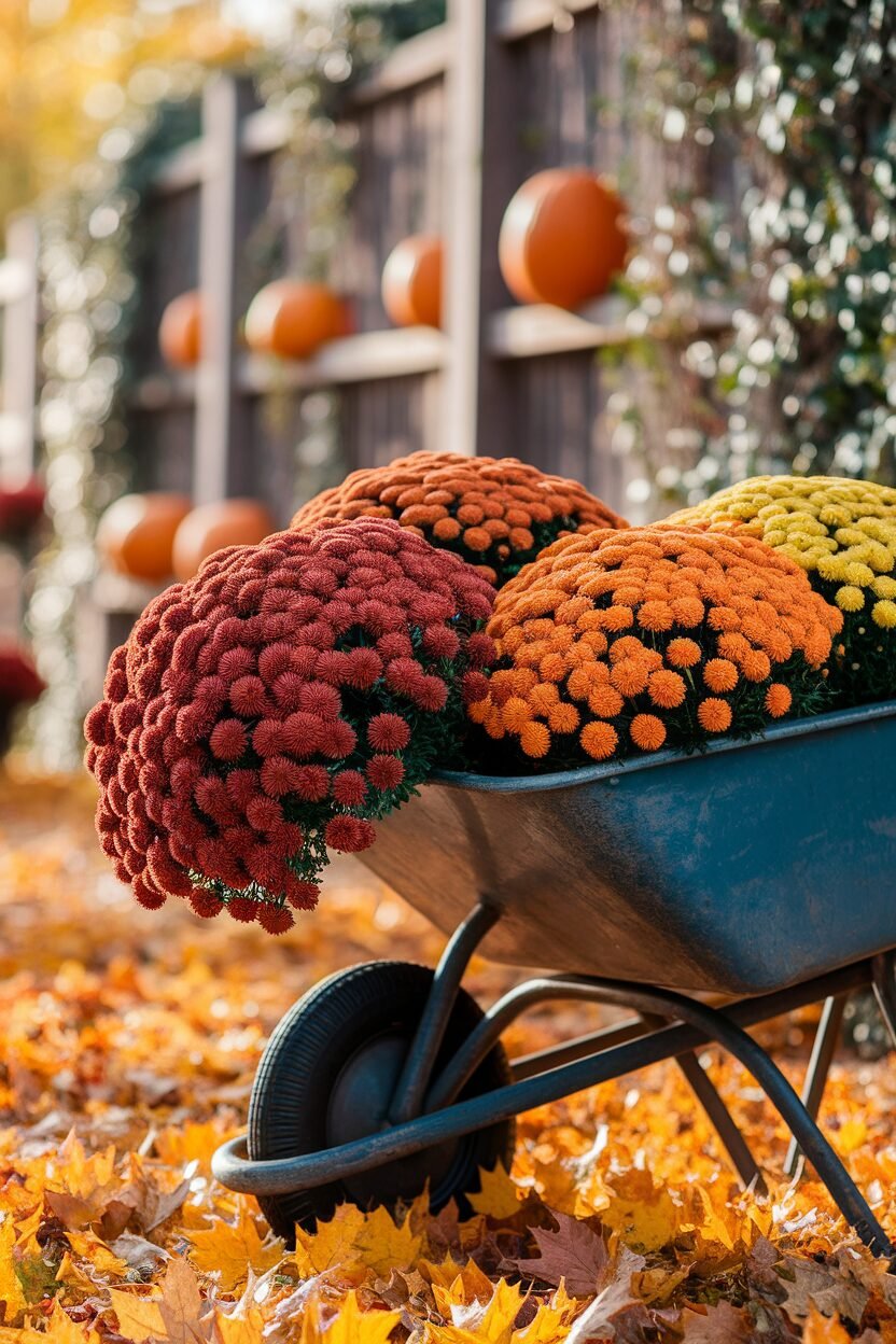 Mix and match fall flowers like sunflowers, marigolds, and daisies. Plant them in pots within the wheelbarrow for a portable garden. The vibrant colors bring life and joy to any corner of your yard.