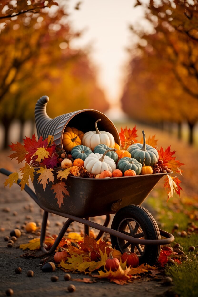 Create a cornucopia effect by spilling out a collection of autumn’s best. Think apples, nuts, and small pumpkins tumbling from your wheelbarrow. This overflowing abundance symbolizes the harvest and can be a conversation starter.