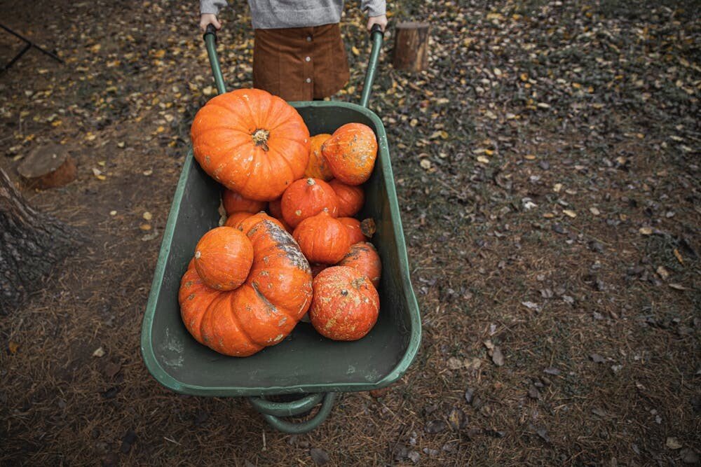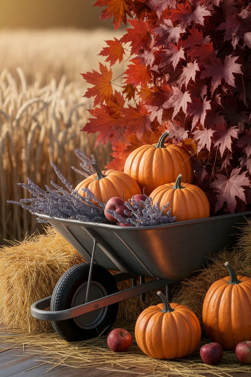 Fill your wheelbarrow with a bounty of pumpkins, gourds, and squashes. Use different sizes and colors to create a rich visual tapestry. The mix of textures and shapes brings out the cozy feel of fall.