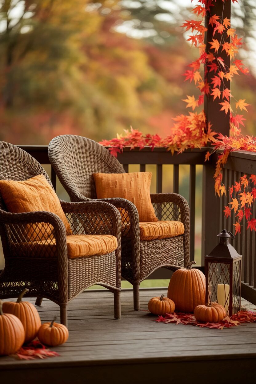 Place a pair of wicker chairs on your porch, complete with plaid cushions and throw blankets. They invite guests to sit and enjoy the crisp fall air. Choose cushions in deep reds or oranges to enhance the fall theme.