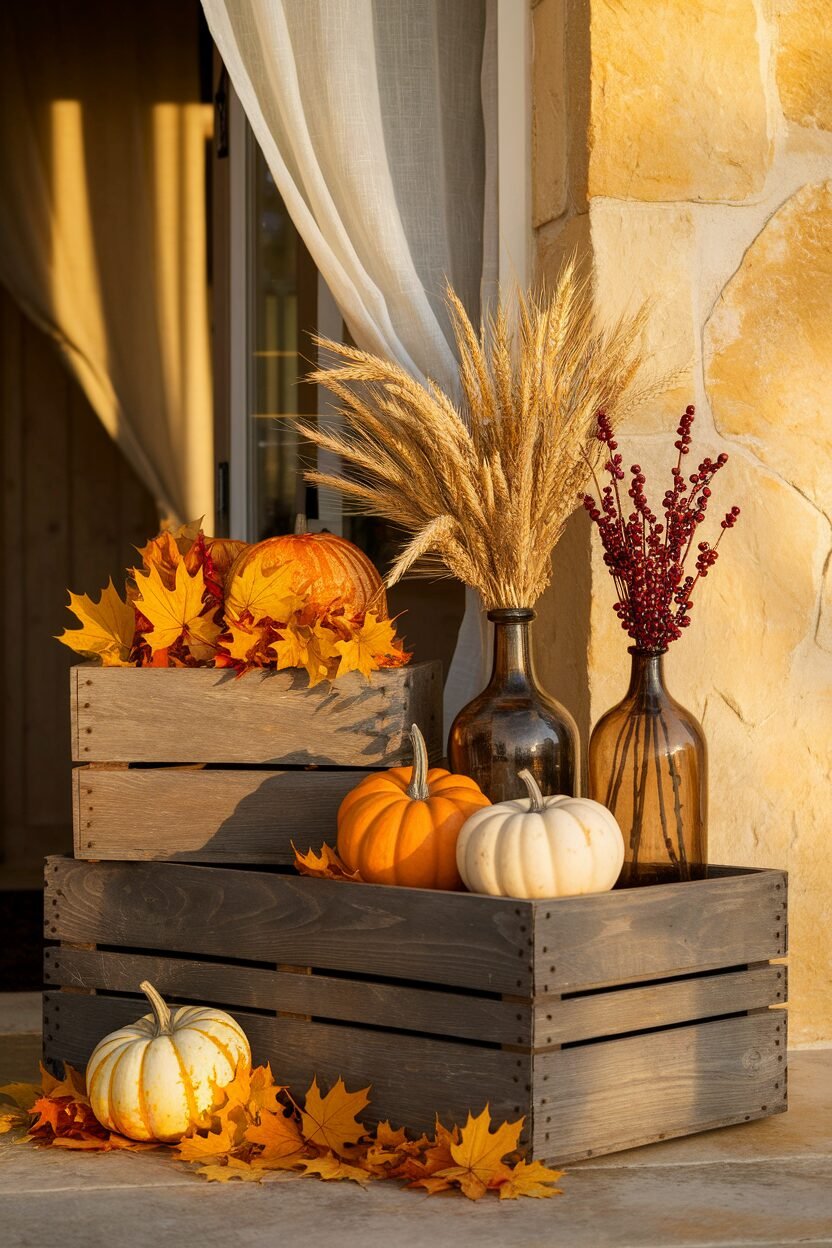 The rustic, weathered wood adds a charming, farmhouse feel that’s perfect for fall. You can find these crates at flea markets or craft stores, often at a reasonable price.