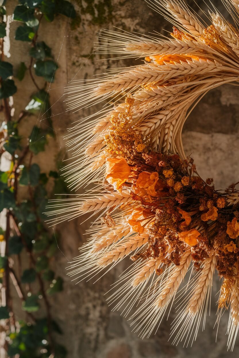A wreath of wheat and wildflowers is a classic yet unique way to welcome guests. The golden hues of wheat combined with colorful wildflowers create a natural, rustic charm.