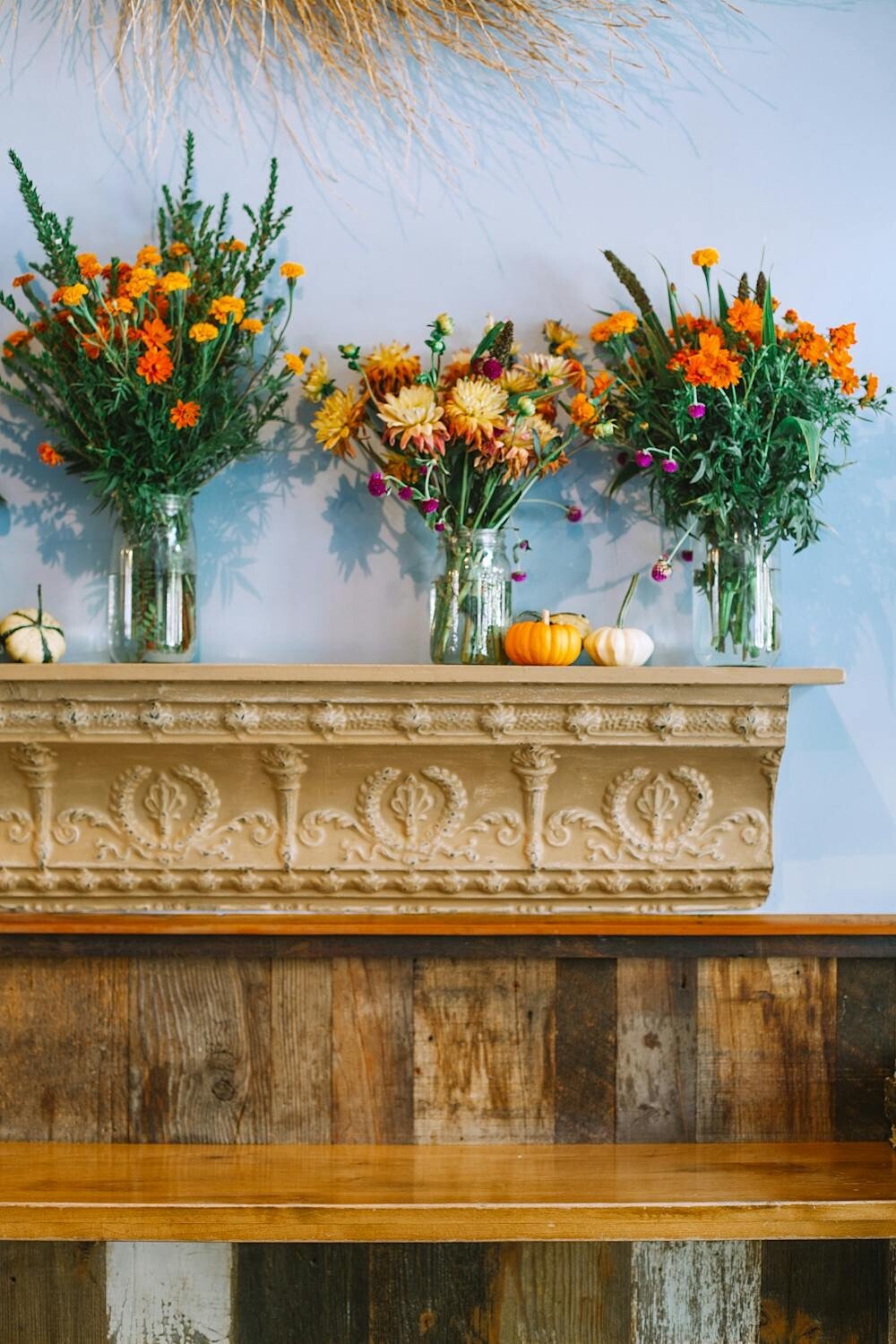 Use mason jars to display a collection of fall flowers. Line them up on a windowsill or mantel for a simple yet charming display.