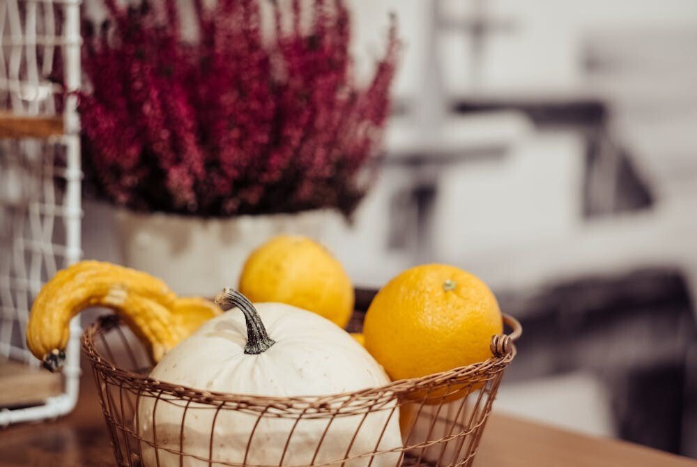 Create a floral arrangement in a woven basket for a country-chic look. Fill it with a mix of fresh or faux fall flowers.