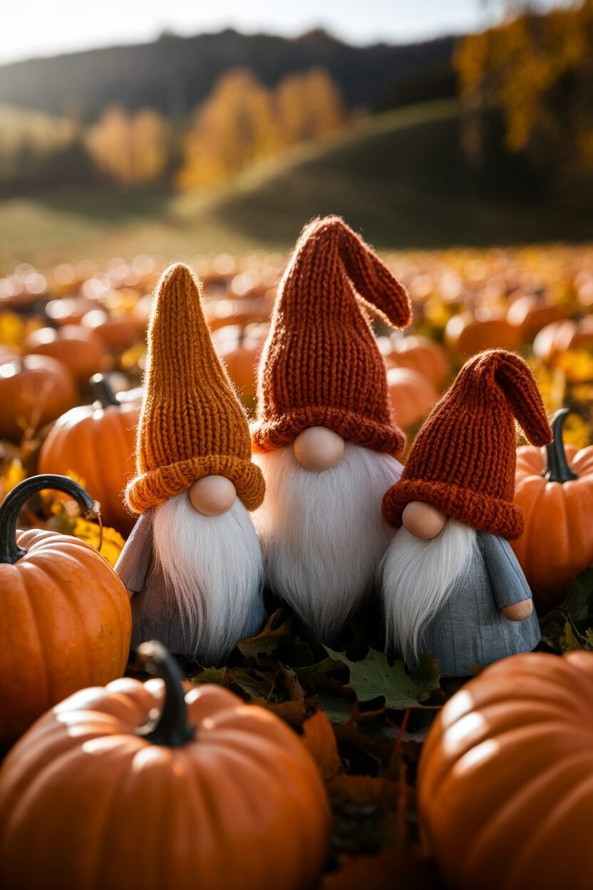 Picture a family of gnomes happily residing in a pumpkin patch. Each gnome has its own personality, making this setup adorable and fun. You can even give each gnome a name and a little story to delight guests, especially kids.