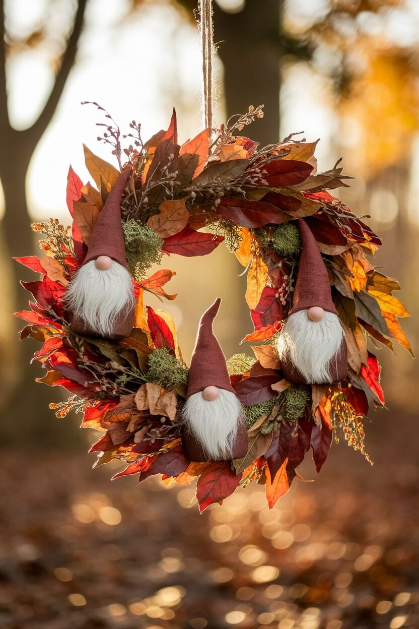 String together a garland of gnomes and fall leaves to hang over a doorway or across a window. This decor idea adds a playful touch to any space.