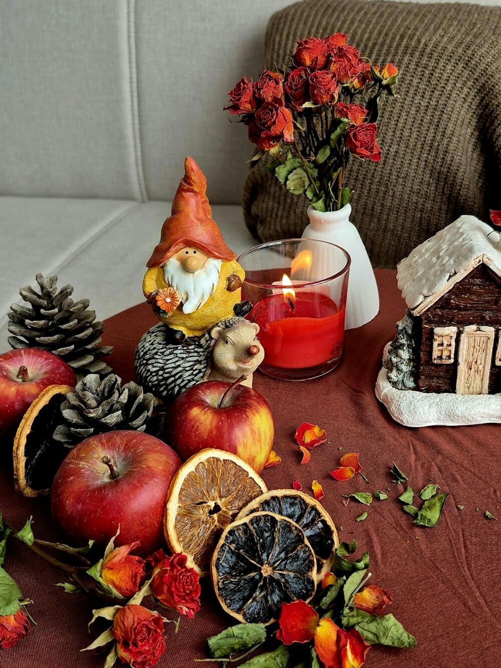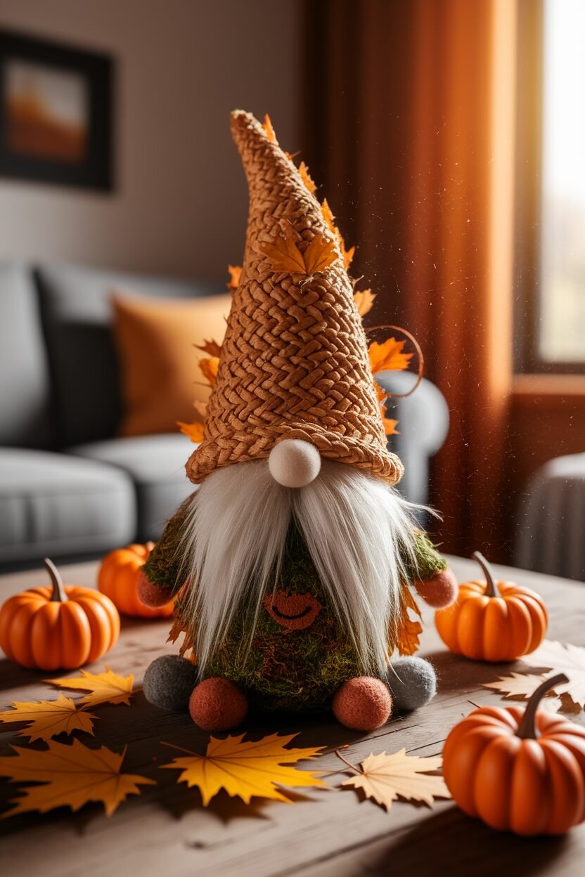 Try adding a few scented candles around it to enhance the cozy feeling. The cost for creating this centerpiece can be minimal, especially if you use items you already have at home. It’s unique because it combines the charm of gnomes with the beauty of autumn harvests.