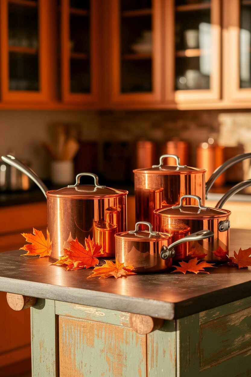 Copper cookware isn’t just functional; it’s stunning. Displaying shiny copper pots and pans can transform your kitchen into a cozy, welcoming space. Their warm hues complement the fall palette beautifully.