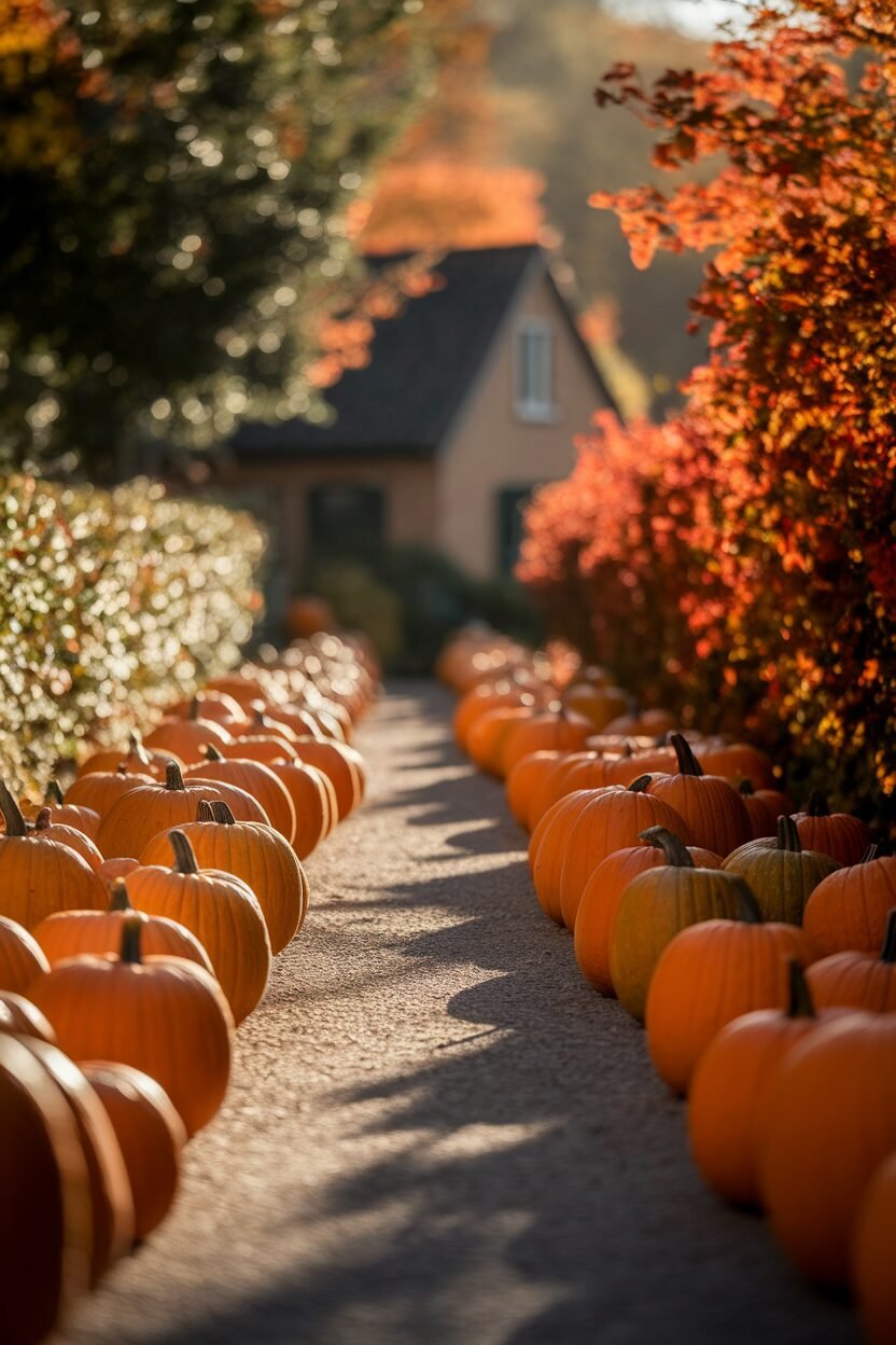 Imagine walking down a path lined with pumpkins of various sizes and colors. This setup creates a whimsical entrance to your home that feels like a journey through a pumpkin patch. Arrange them in a way that leads your guests right to your front door.