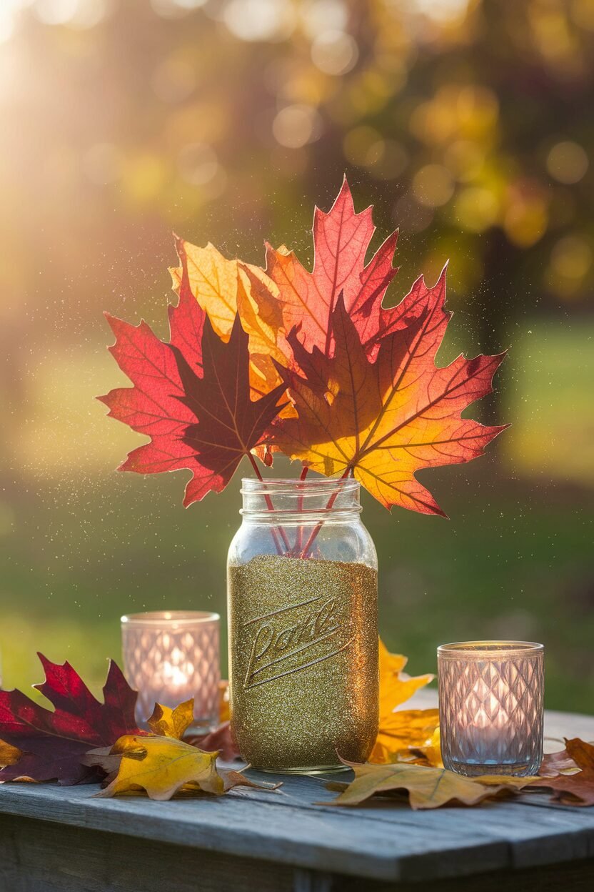 Picture this: a mason jar covered in shimmering leaves that catch the light just right. These jars are perfect for adding a touch of sparkle to your fall decor. Use real leaves painted with glitter or opt for faux leaves covered in a glittery finish.